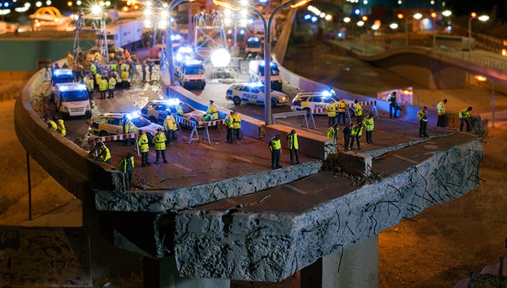 Peer through holes cut into a forty-foot shipping container at a vast landscape modelled in a miniature scale of 1:87: a desolate, mythical English town frozen in the aftermath of a riot, where only police and media crews remain. After appearing at Banksy’s Dismaland in 2015, ADP now tours the world.
