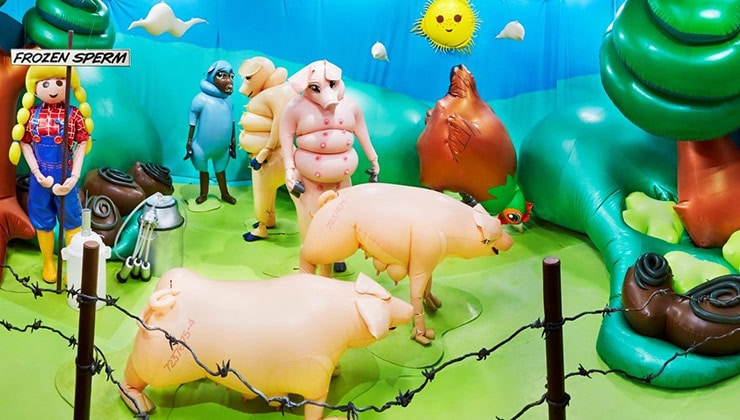 A latex wonderland inside an old theatre, dreamt up by Japanese artist Saeborg with her self-made Kawaii kink craft. A giant pig gives birth in Pigpen to a litter of scrambling, human-sized piglets, desperate to suckle and feed. Nearby, livestock cavort around an inflatable, technicolour farmyard in Slaughterhouse-15, and act out a demented circle of life.