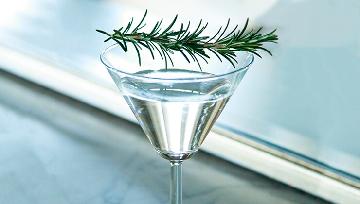 Discard the ice from your martini glass, and strain the martini into it. Rub a rosemary sprig around the rim of the glass and discard.