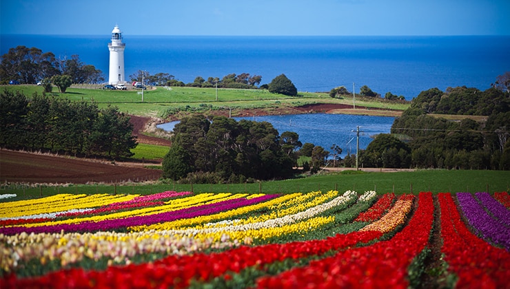 Red, purple, pink, orange, yellow and white, spring brings the island’s most amazing riot of colour to Table Cape Tulip Farm. Row after row of blooming tulips stretch away, with the surrounding green fields, blue Bass Strait and a white lighthouse forming an ideal backdrop. It’s an explosion of colours like you’ve never seen before.