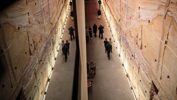 Did you know most of Hobart’s world-renowned museum of old and new art is underground? Descend into Mona via the spiral staircase or glass elevator and discover this vast labyrinth carved out of Triassic sandstone. With golden, natural patterning and marks left by heavy cutting machinery, this raw rock forms the monumental walls of gallery spaces and the epic Void Bar. What better place to savour Tasmanian whisky on the rocks than 17 metres underground?