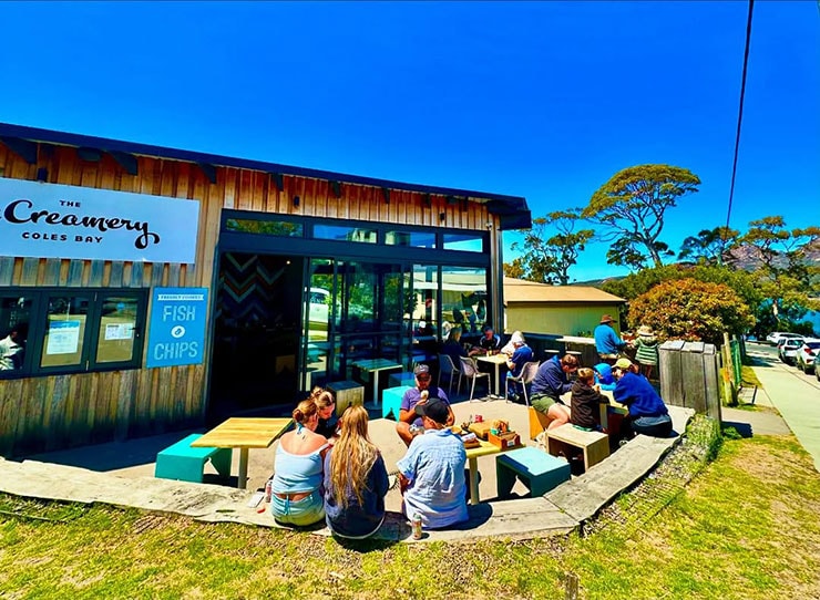 Enjoy a scoop or three, a sundae, or drinks made better with ice-cream like iced coffee and milkshakes. The proverbial cherry on top is the view from the deck: beautiful Coles Bay with the pinkish Hazards mountains just beyond.