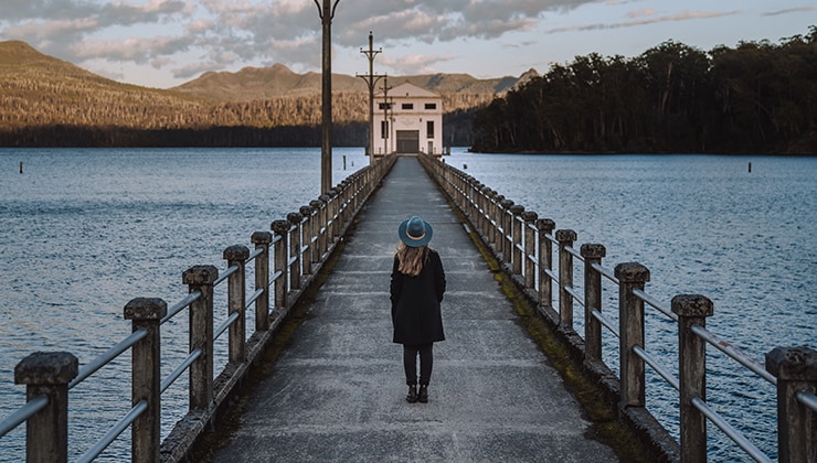 A solitary structure at the end of a long pier in the middle of Lake St Clair, with bushland and mountains beyond: this is Pumphouse Point. This is one of just two 1940 hydro-electric station buildings converted into truly unique accommodation notable for understated luxury.