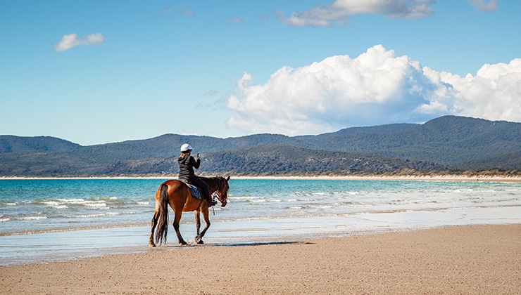 Horse-riding on Bakers Beach, Narawntapu National Park. Photo: Tourism Tasmania & Brian Dullaghan.