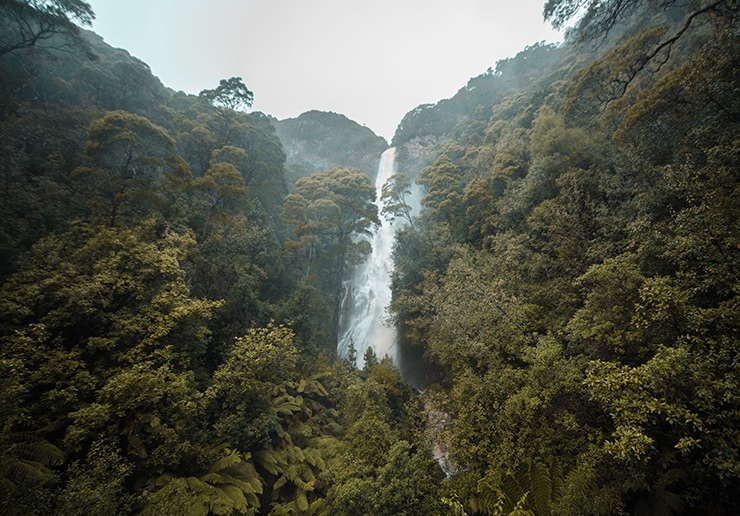 Mighty Montezuma Falls drops more than 100 metres amid cool rainforest of towering trees, ferns and colourful fungi. Three hours return on a fairly flat former rail line, one of Tasmania’s 60 Great Short Walks puts you at the waterfall’s base, and reveals another awesome view of it from a bridge.